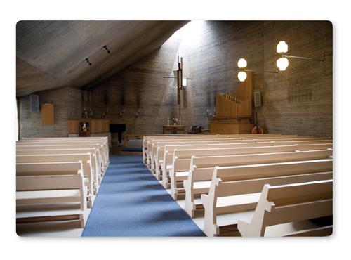 En unik byggnad enligt Le Corbusier som rankade kyrkan som en världens tre vackraste. Färdigställd 1956 i dåtidens första ABC-område, Vällingby. Ritad av Carl Nyrén och sitter samman med ett bostadshus. Rummets väggar är av sandblästrad betong, gjuten mot brädform. Byggnaden är putsad utvändigt och taket är belagt med koppar.