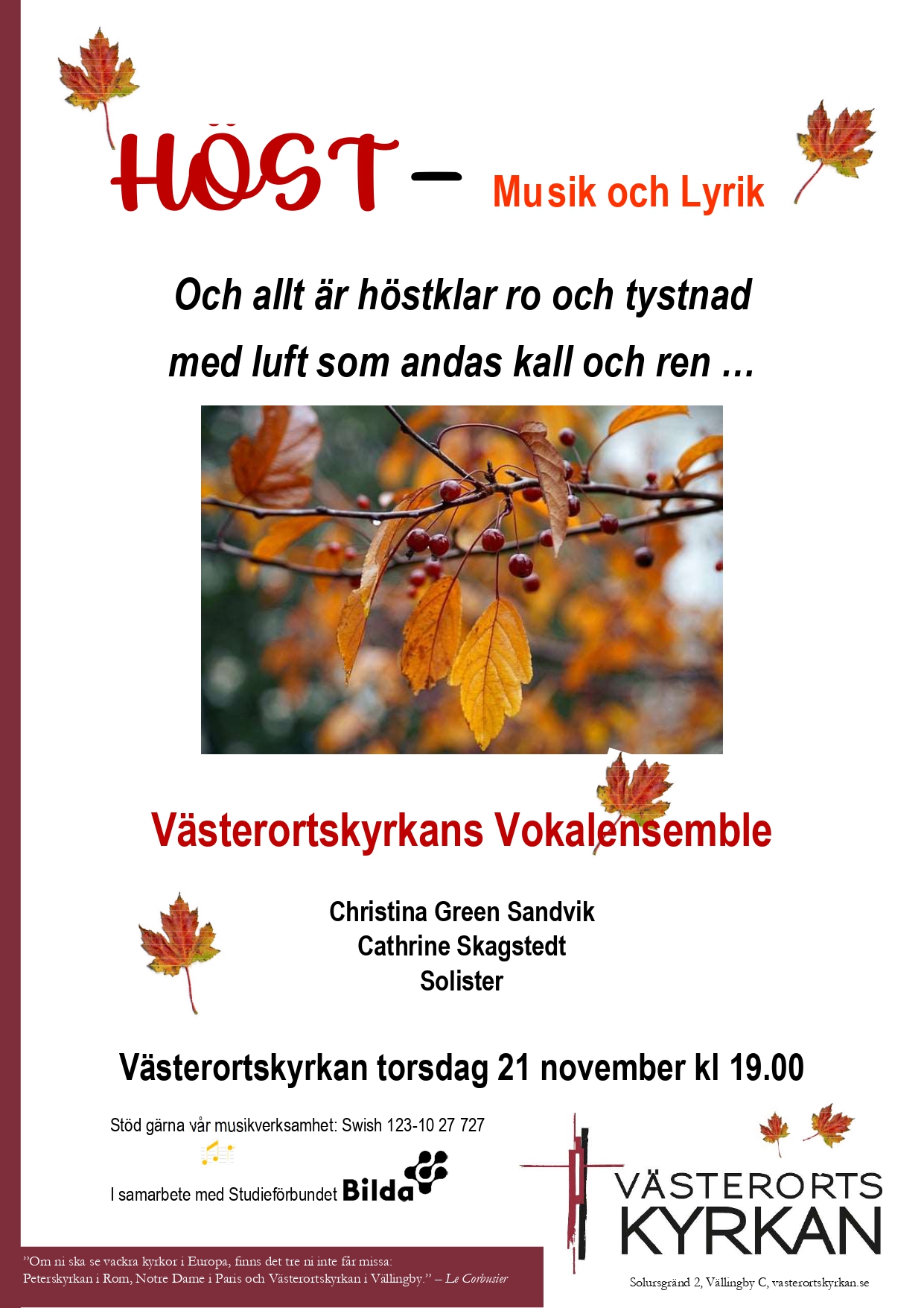 Höstkonsert – Västerortskyrkans vokalensemble 21 nov kl 19