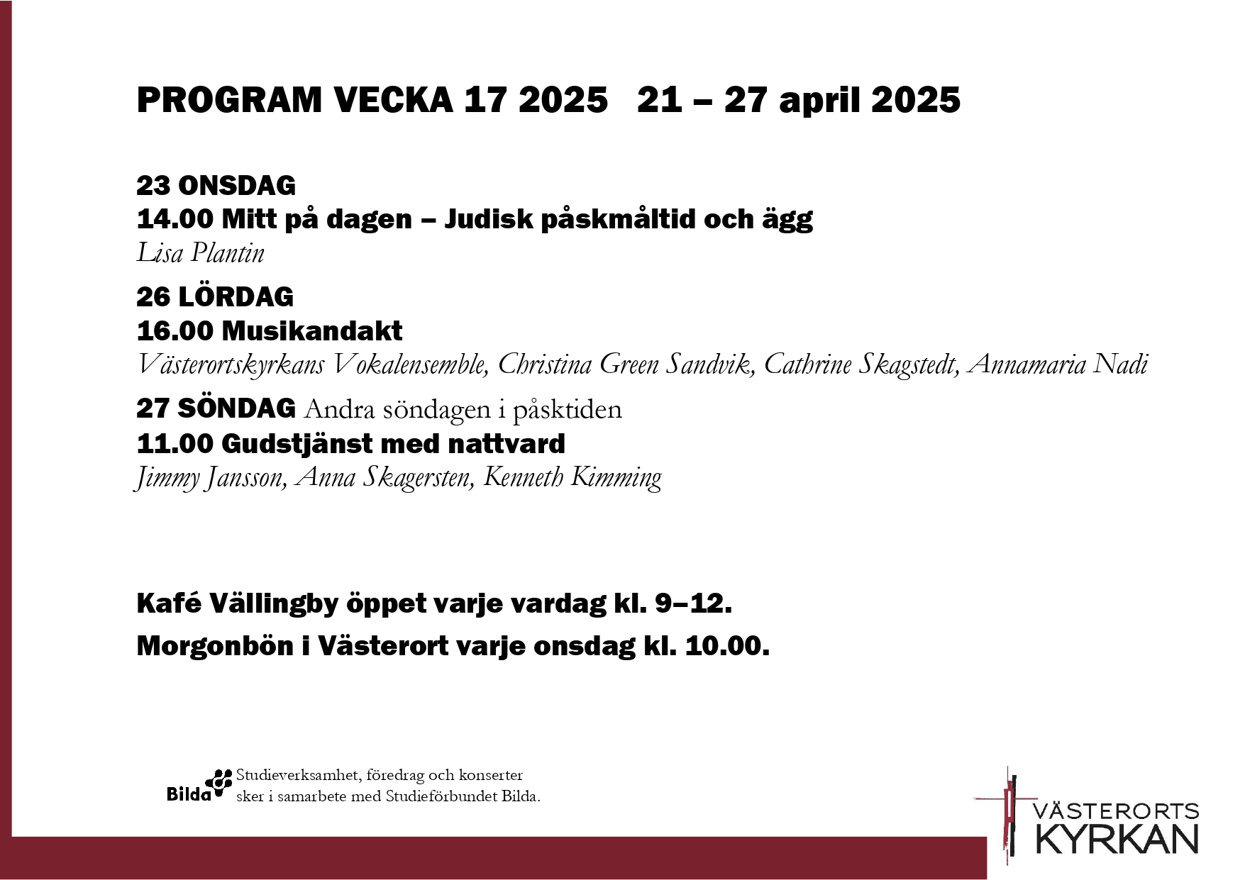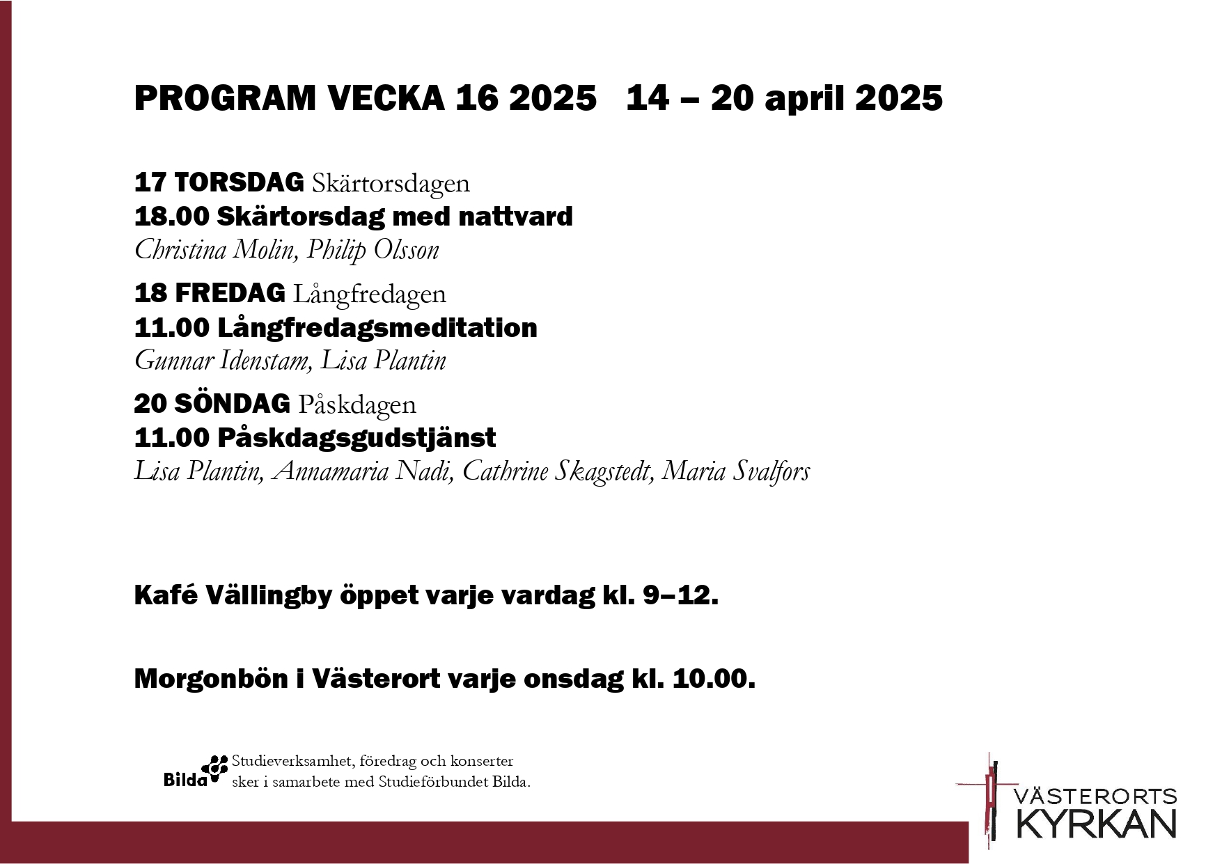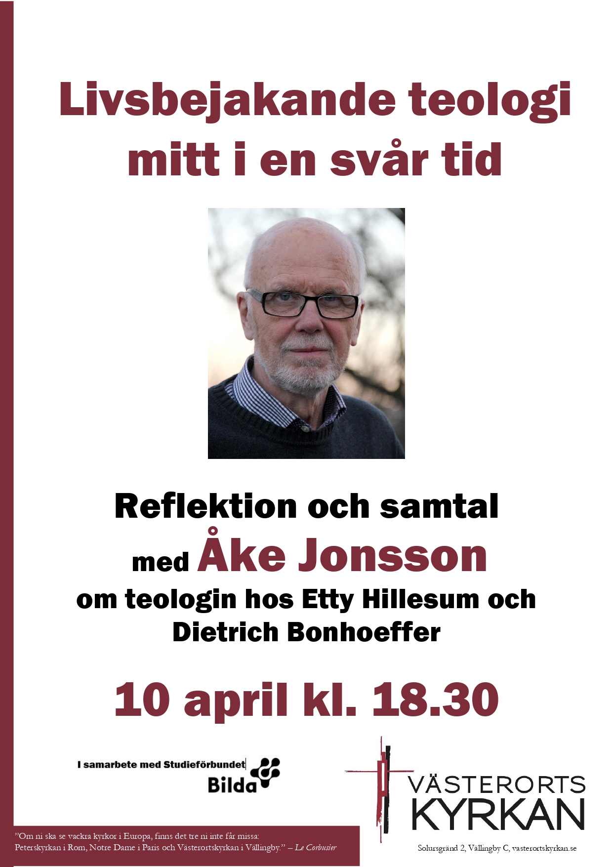 Torsdag den 10 april kl 18.30 är du välkommen till en kväll om ”Livsbejakande teologi mitt i en svår tid”. Samtal och reflektion om teologin hos Etty Hillesum och Dietrich Bonhoeffer. Samtalet leds av Åke Jonsson. Varmt välkommen till Västerortskyrkan!