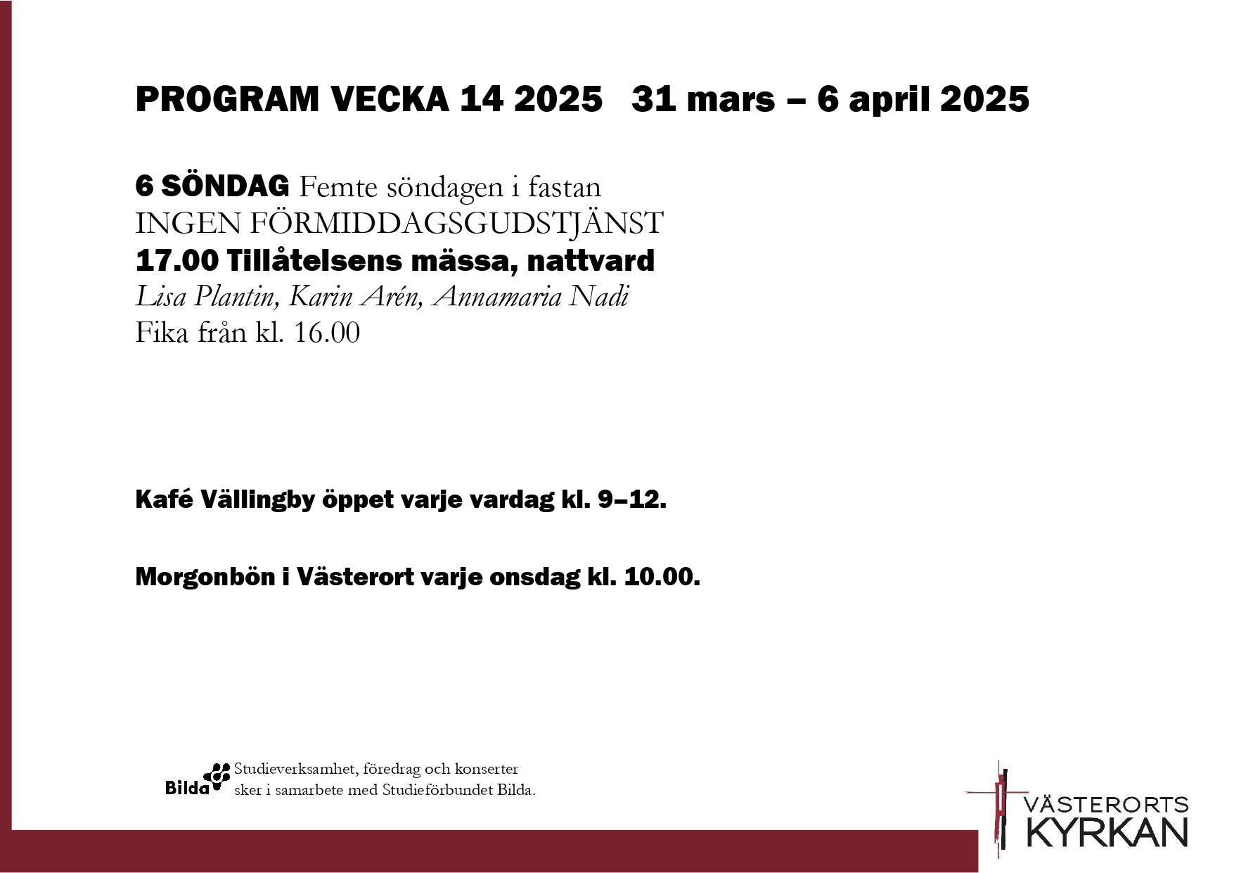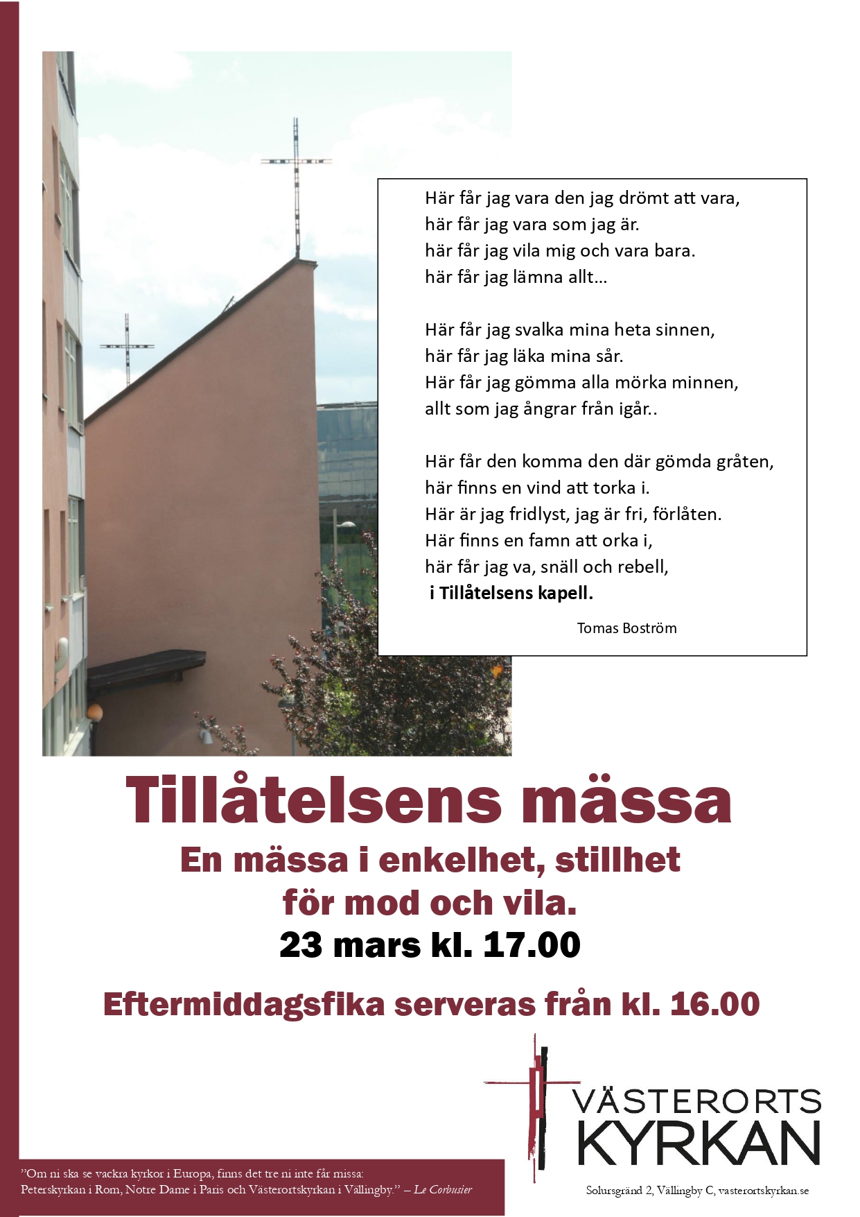 Tillåtelsens mässa – En mässa i enkelhet, stillhet, för mod och vila. 6 april kl. 17.00