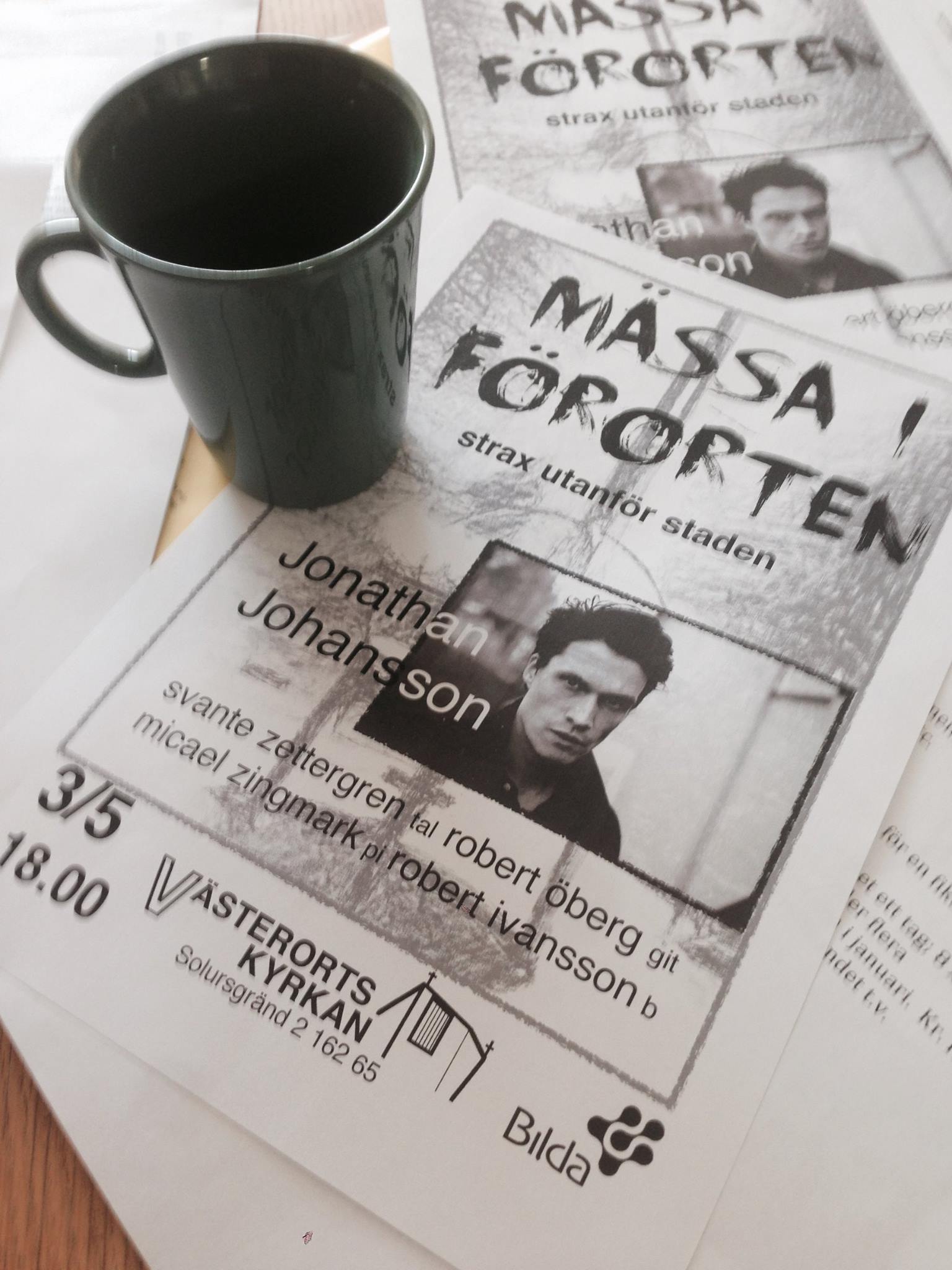 Söndag 3 maj 18.00 MÄSSA I FÖRORTEN med Jonathan Johansson. Robert Ivansson bas, Micael Zingmark flygel, Robert Öberg elgitarr, Svante Zettergren tal.